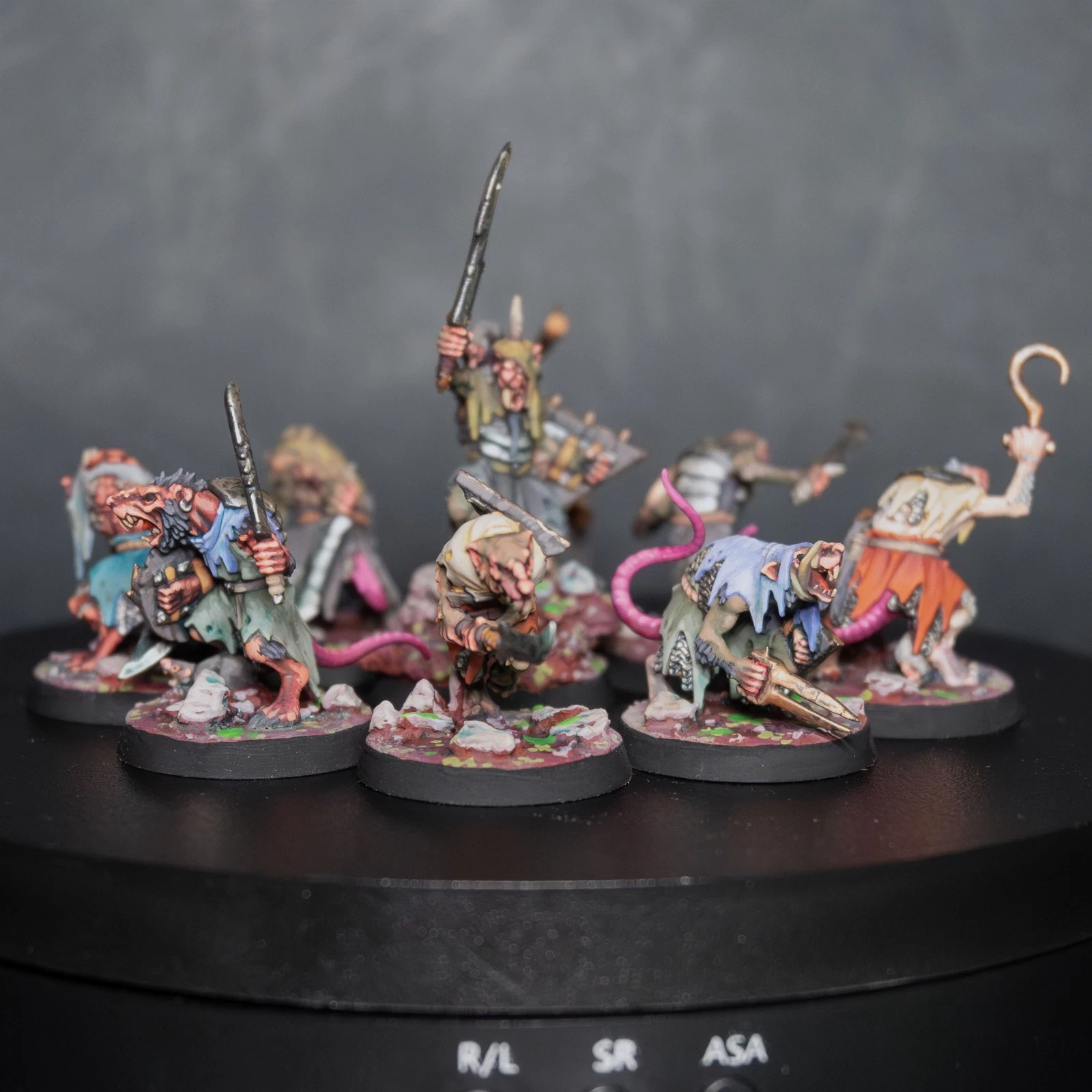 Una vera marea di roditori. 40 Clanrats dipinti con uno schema coerente e sporco, pronti a sopraffare ogni nemico nel nome del Grande Ratto Cornuto.